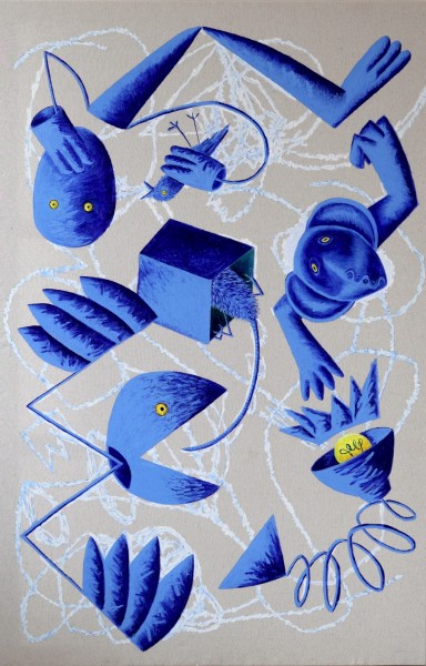 Lorsque j’ai découvert son travail il y a une dizaine d’années, la peinture se déployait dans un geste dessiné, d’une  grande nervosité, aux tracés instinctifs. Tout, alors, allait très vite. La feuille de papier japonais ou de gros carton était traversée à la hâte, comme en plein ciel, comme s’il s’agissait d’attraper au vol quelque chose qui allait s’évanouir. On y comptait beaucoup d’instruments de capture. Le sol se dérobait sous la maison. Les figures se déchiraient. Le peintre lançait ses lignes au-dessus du vide.