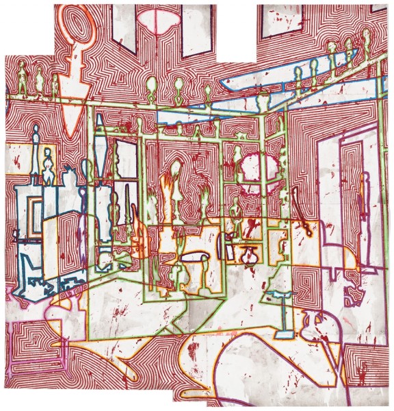Les deux peintures les plus récentes de Chasing Ghosts traduisent des images stratifiées issues de sources historiques occidentales en compositions matériellement complexes, réfléchissant aux notions de déplacement culturel, de complicité et de survie. Réalisées sur des patchworks de tissu et achevées à l’huile, ces œuvres mobilisent des processus de superposition, d’érosion et de hasard afin d’évoquer l’histoire comme un champ instable et sédimenté, un espace où les régimes dominants sont symboliquement absorbés et neutralisés. Les couleurs vives et les lignes rayonnantes agissent à la fois comme contrepoint visuel et force connective, offrant une surface accueillante à travers laquelle se déploient, de manière feutrée, des interrogations profondes sur le pouvoir, la mémoire et la transformation culturelle.
