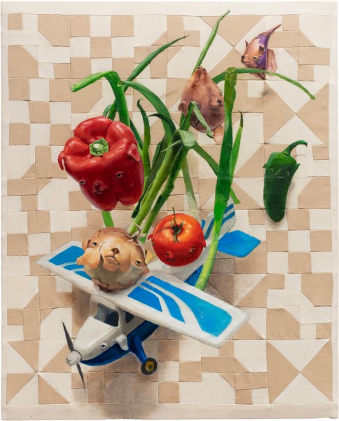 La peinture consacrée à New York opère un changement tant matériel qu’émotionnel. Utilisant les panneaux de contreplaqué vert omniprésents sur les chantiers de construction de la ville, Morrison superpose des objets rencontrés au fil d’une journée imaginaire de déambulation urbaine. La composition évoque une cascade de mouvements précaires, inspirée par la logique des machines de Rube Goldberg, à la fois fantastiques et dénuées de finalité. Plus désordonnée, plus ludique et plus cinétique, l’œuvre reflète l’expérience vécue de l’artiste à New York comme un lieu d’immédiateté, d’improvisation et d’appartenance.