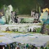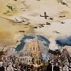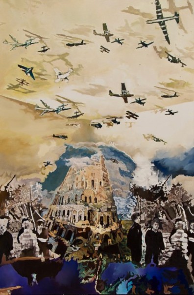 Prenons son tableau Apesanteur. Que se passe-t-il à l’intérieur de ce ciel ? Plusieurs types d’avions y planent dans une formation circulaire nonchalante, ne se déplaçant pas tous dans la même direction. Plus étrange encore : ce sont des appareils issus d’époques différentes, des biplans côte à côte avec des avions de ligne, eux-mêmes aux côtés de moteurs à réaction contemporains. Où sommes-nous, et plus important encore, quand sommes-nous ? Ajoutant au paradoxe de cette peinture, sous ces avions tournoyants se dresse ce qui ressemble à une colonne effilée, une tour de Babel, conformément au récit biblique décrivant l’édifice que les humains entreprirent d’ériger pour atteindre le ciel. Autour de cette structure, sur la périphérie de la composition, se tiennent divers enfants vêtus de noir, les mains inactives ou croisées sur la poitrine, qui semblent attendre que l’univers se rétablisse et mette fin à ce désordre où le temps et l’espace se mêlent. Que se passe-t-il donc maintenant ? Impossible de dire quelle est la « vraie » réalité. Est-ce le monde des enfants ? Celui des avions, témoins de niveaux technologiques différents ? La tour tournoyante de l’ambition humaine ? Ou encore cet étrange bassin indigo en contrebas ?