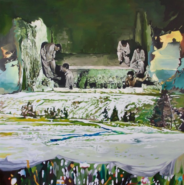 Dans son œuvre Coulisses, la partie supérieure de la toile semble décrire une scène à l’intérieur d’une grotte où cinq travailleurs — tous, sauf un, vêtus d’un uniforme gris clair — s’affairent à un labeur indéterminé, peut-être une excavation. Mais sous eux, avançant vers le premier plan de la peinture, s’étend un large champ neigeux tacheté d’arbres verts. Au bas de la toile, ce champ se transforme en une corniche rocheuse, sous laquelle une autre prairie de fleurs blanches, portées par des tiges vertes ou jaunes, s’élève vers la lumière. Regardez de nouveau la grotte, comme je le fais maintenant, et vous remarquerez qu’à sa gauche et à sa droite s’ouvrent des brèches par lesquelles une mer apparaît. La vie qui n’est pas ici, nous dit Navi, demeure toujours sur les lisières de nos sens, éveillant nos perceptions, les incitant à élargir leur portée.